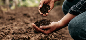 Hand of farmer inspecting soil health before planting in organic